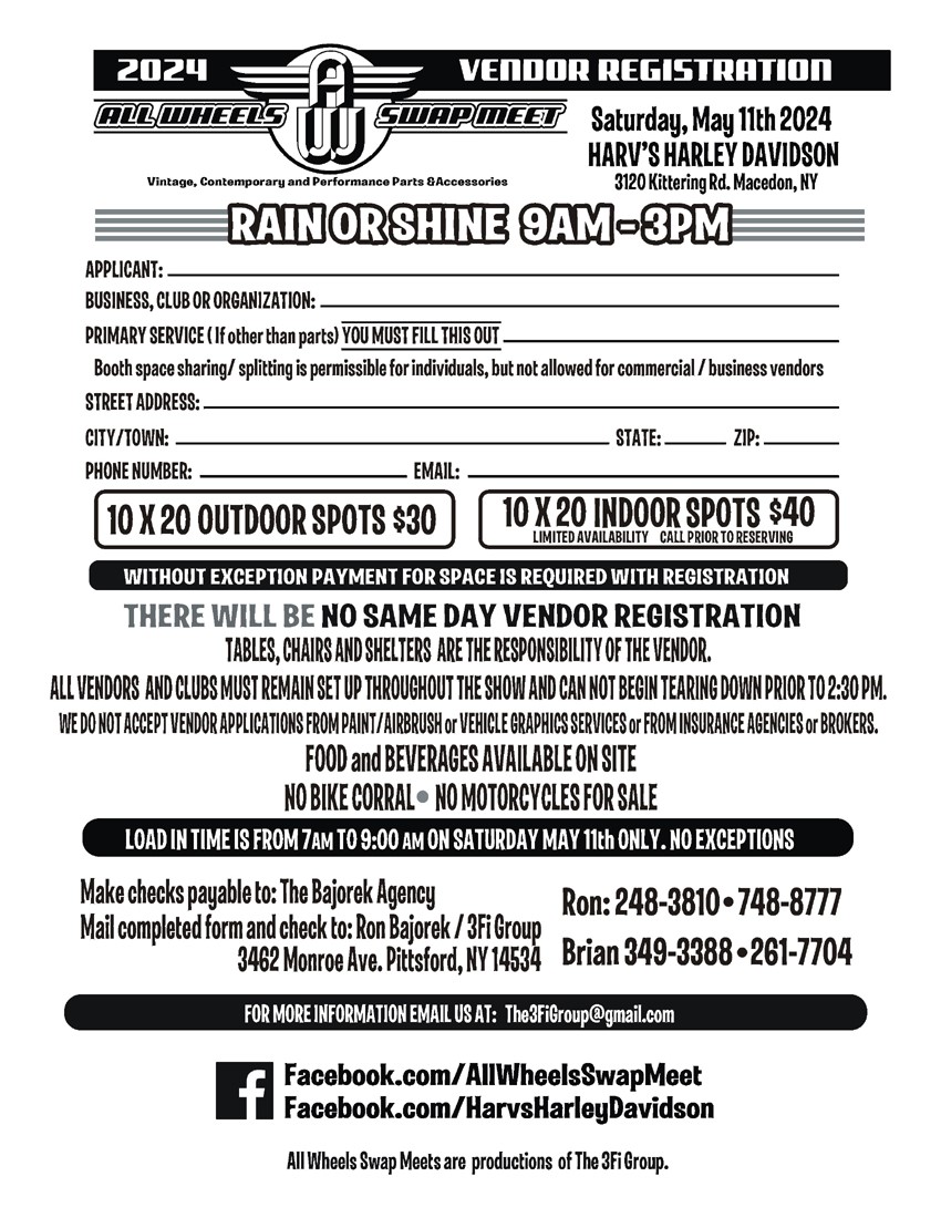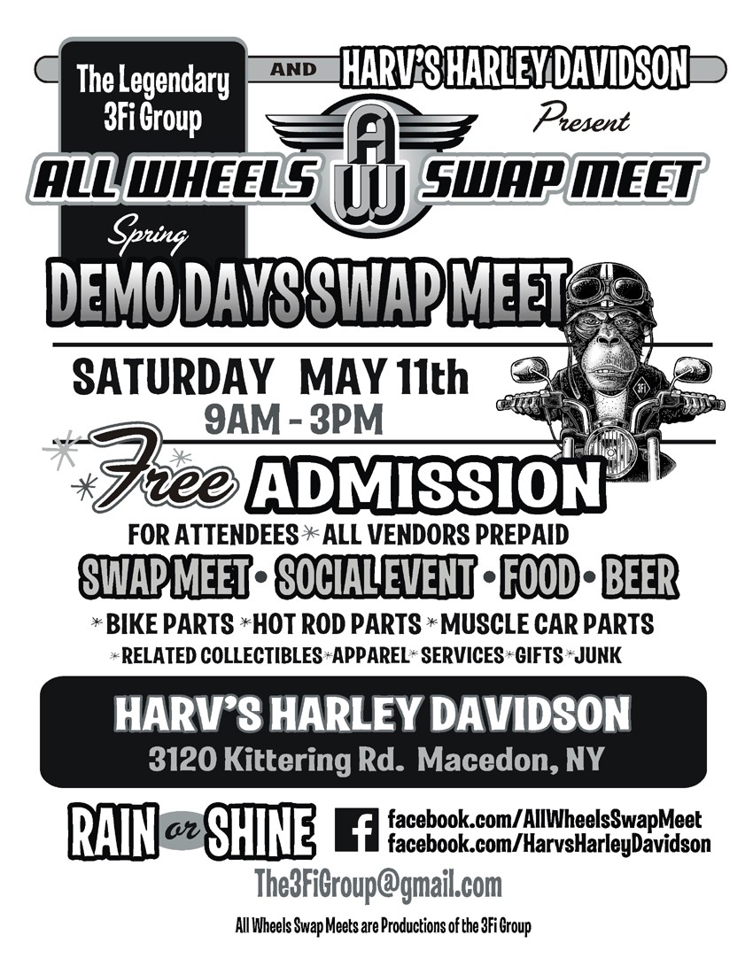 “Spring ’24” All Wheels Swap Meet Posted on December 1, 2022May 1, 2024 by thebrush “Spring ’24” All Wheels Swap Meet Saturday May 11th 9:00 AM – 3:00 PM Harv’s Harley Davidson 3120 Kittering Rd., Macedon, NY